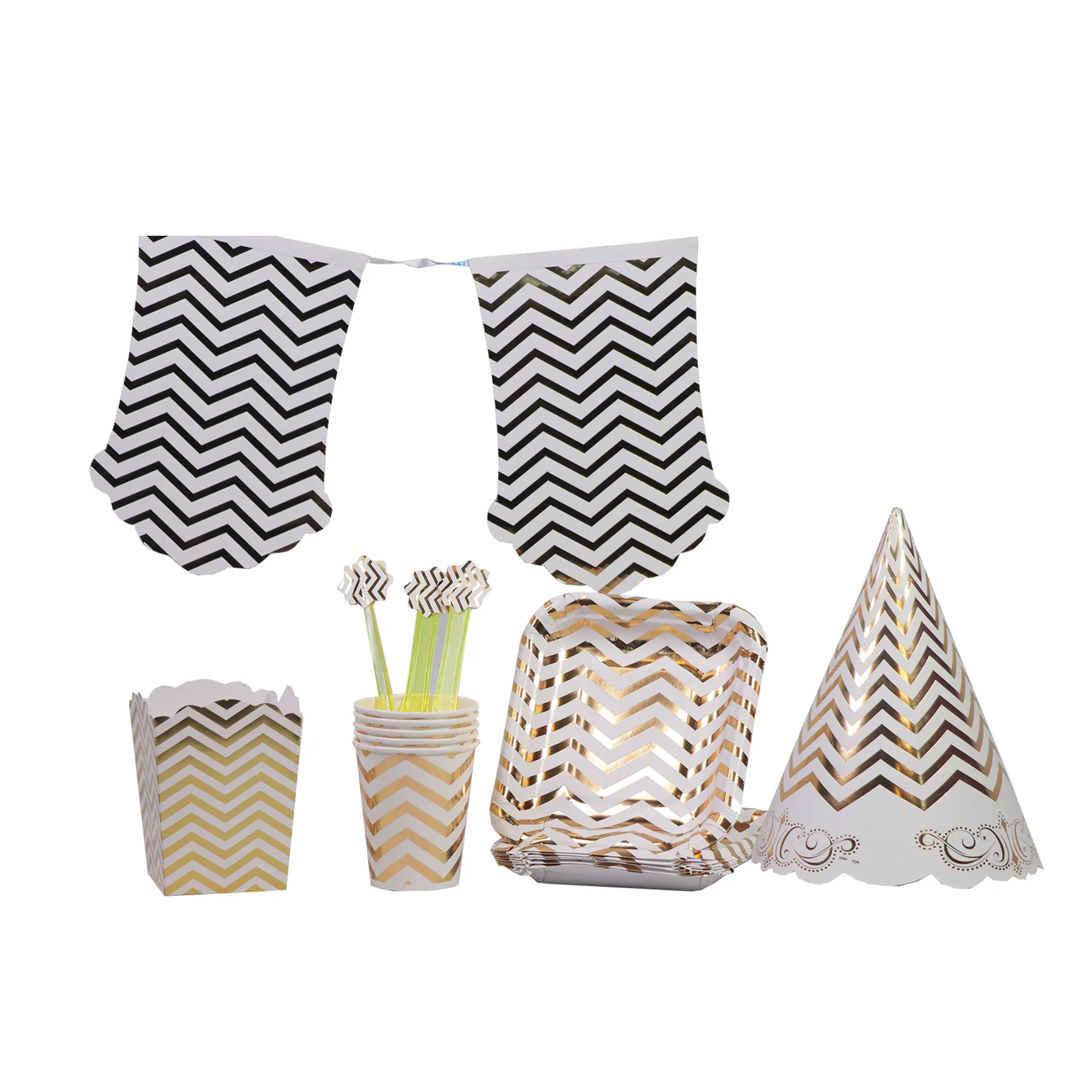 این تم شامل : کلاه, ریسه, بشقاب و لیوان, قاشق و چنگال, بادکنک فویلی گرد, تاج طلاکوب, دستمال کاغذی و .. میباشد.